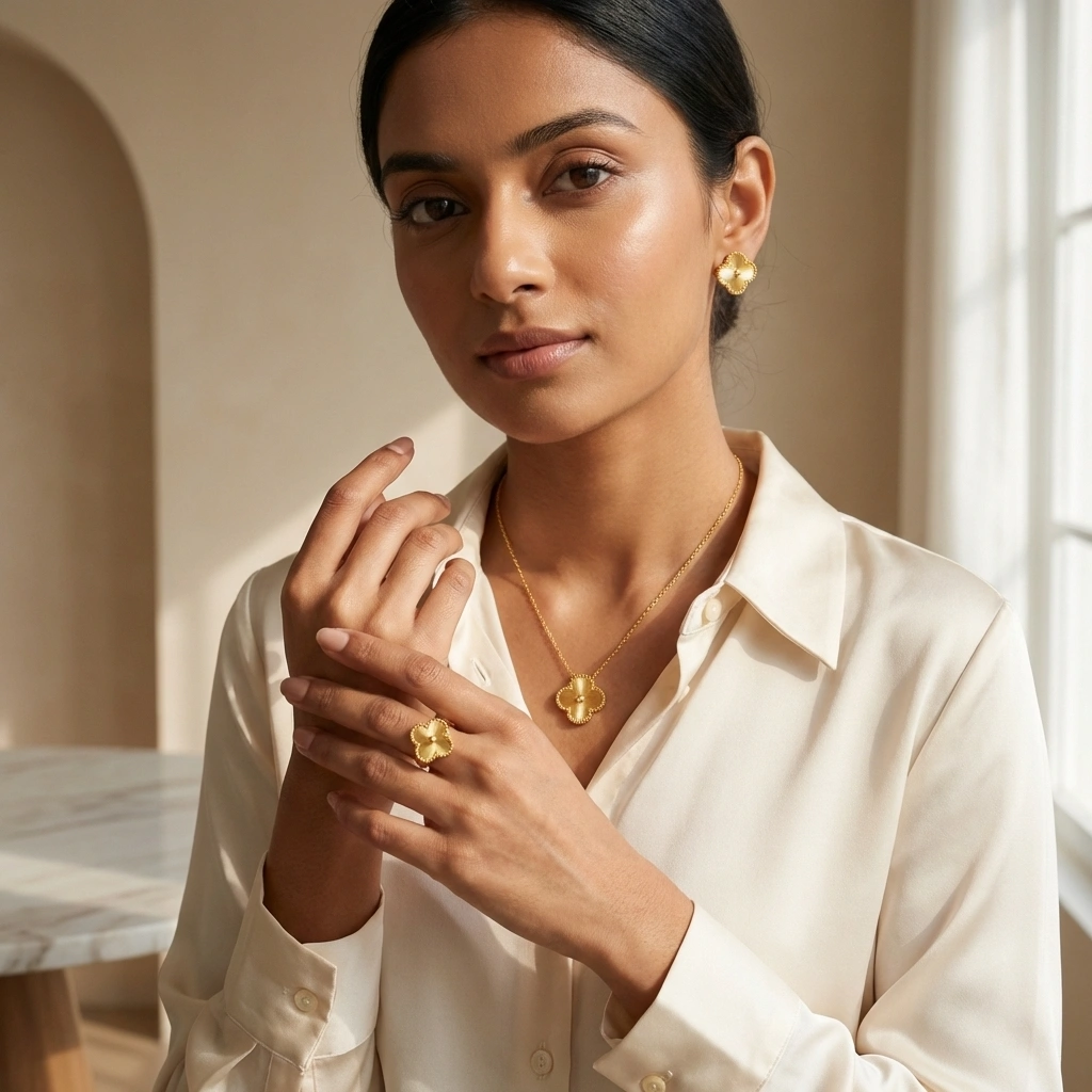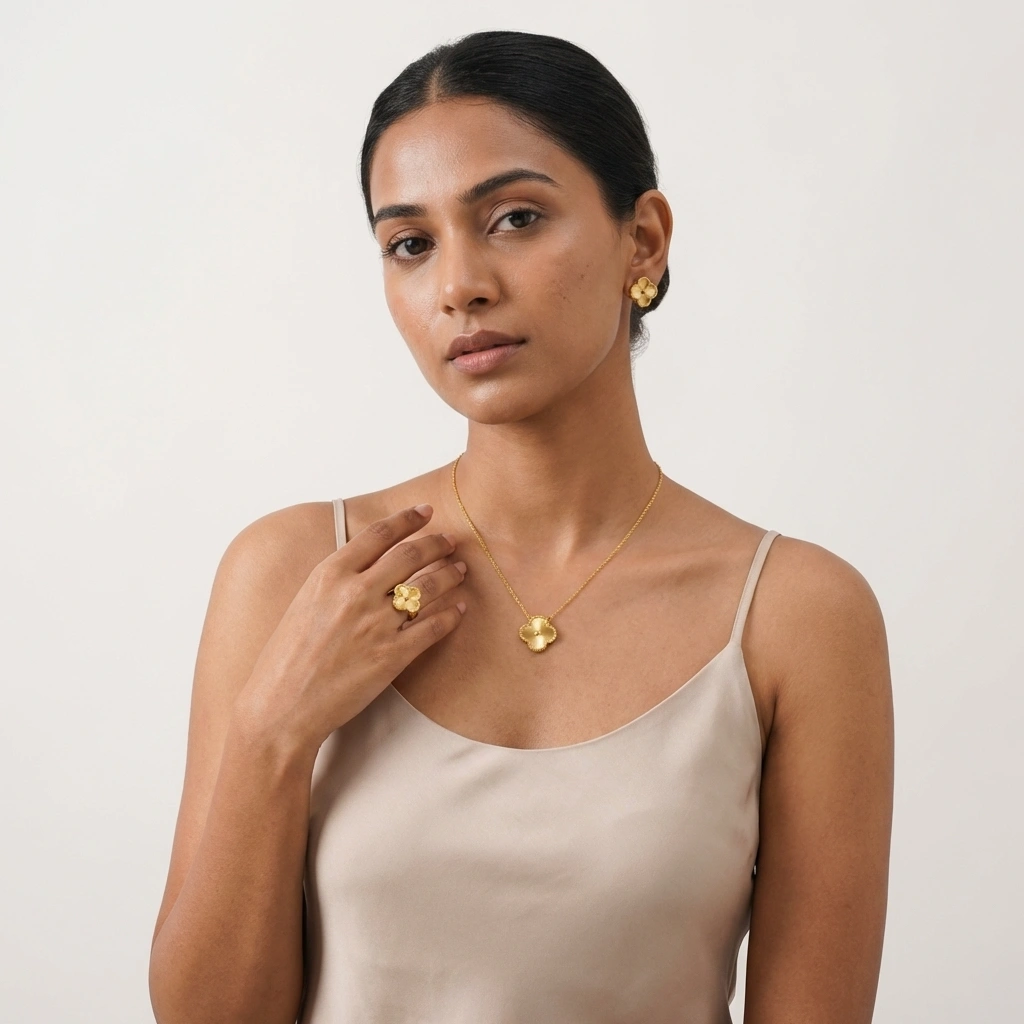 • Sweat-safe and comfortable for long hours, complete with matching stud earrings and a fully adjustable necklace and ring for the perfect fit.
