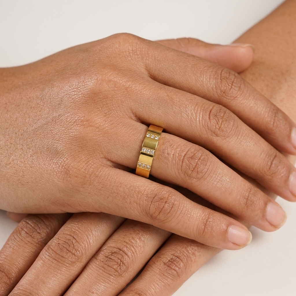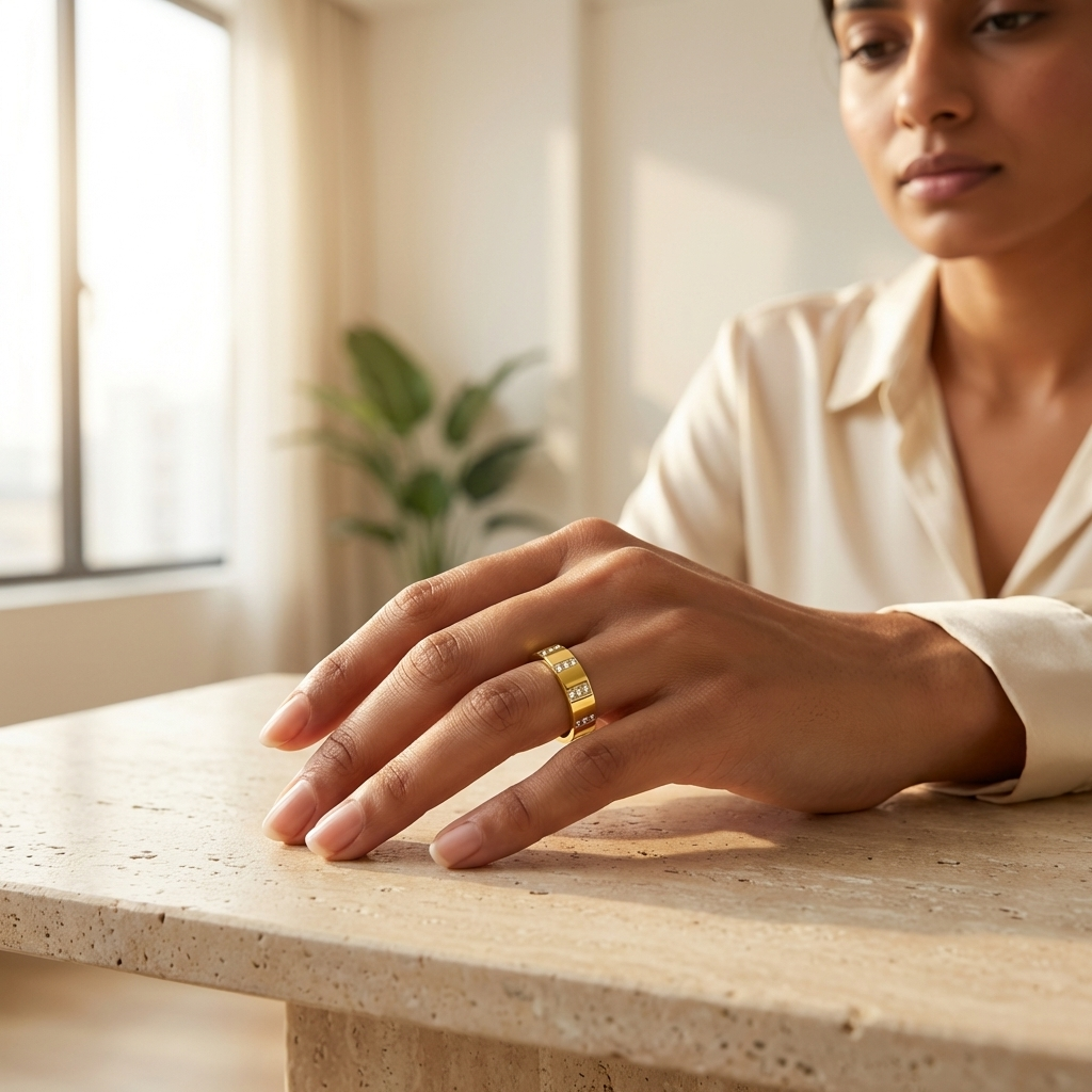 - Minimal polished finish with a delicate vertical stone setting, sweat-safe and comfortable for long hours.