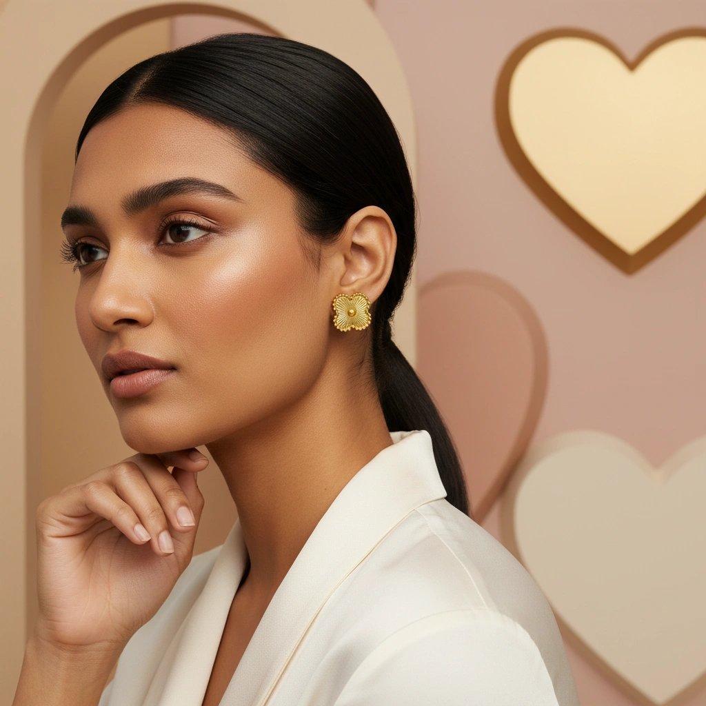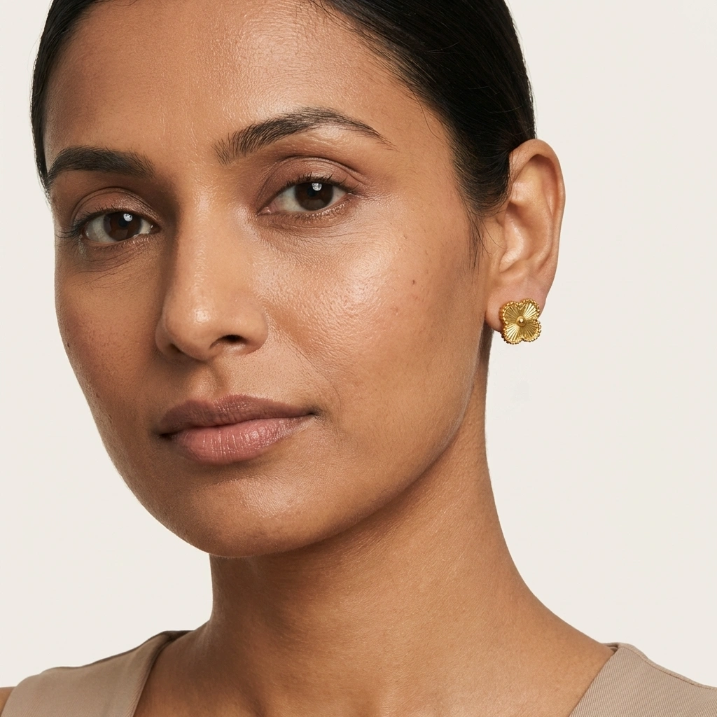 - Showcases an elegant Alhambra-style clover design featuring a textured sunburst pattern. They are sweat-safe and gentle on the skin for long-lasting comfort.